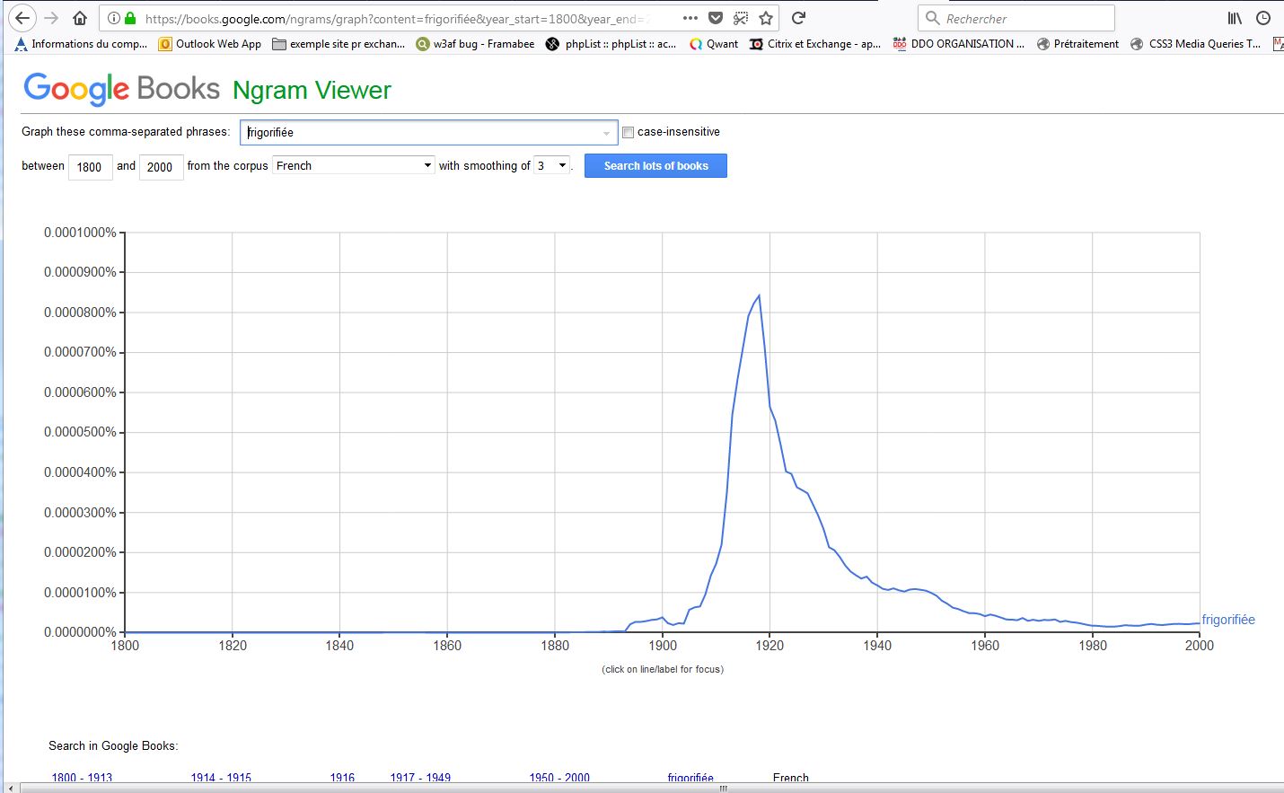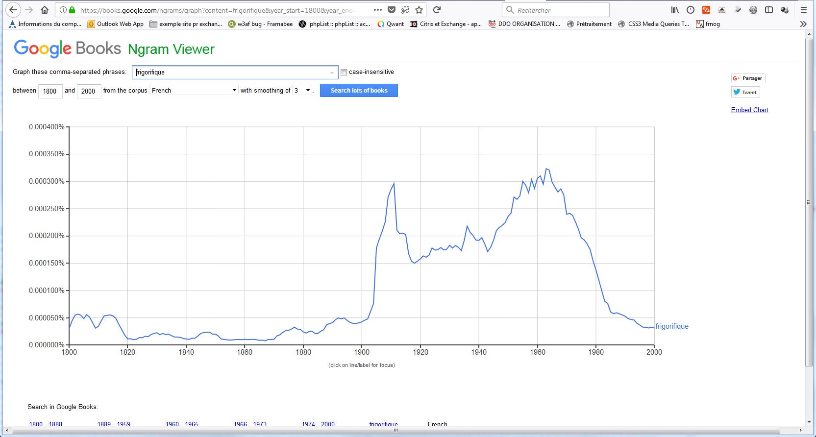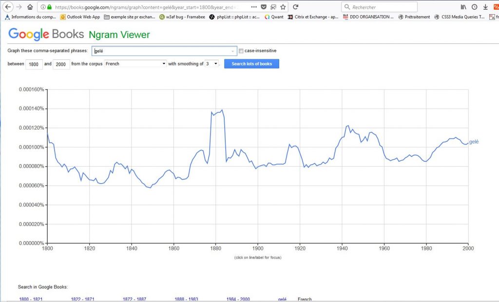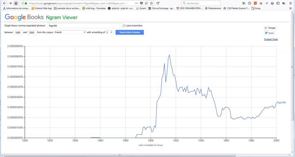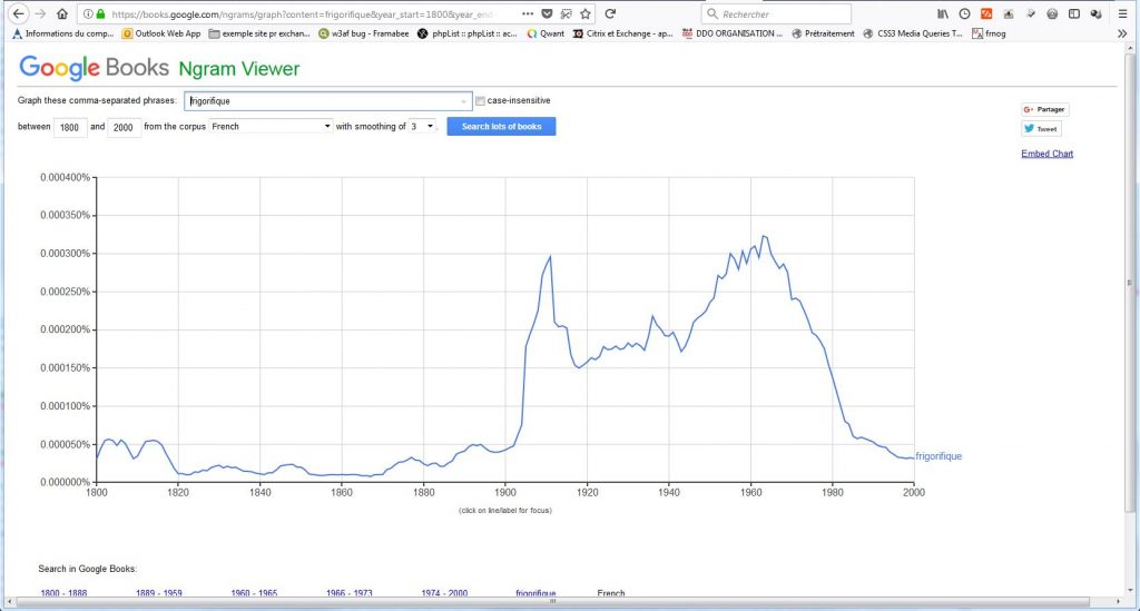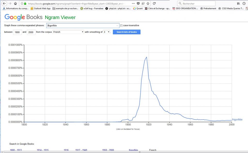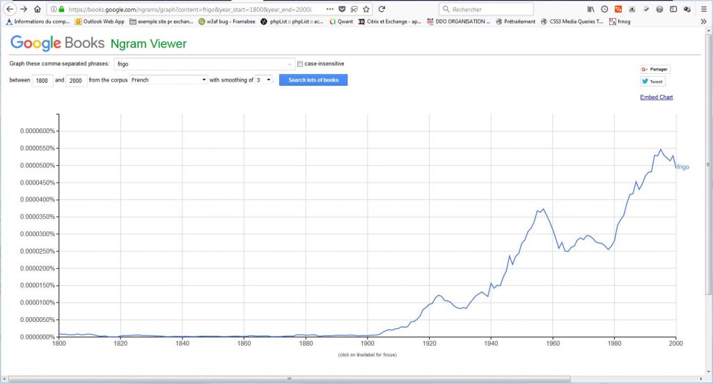 Ainsi si l’utilisation du “mot” (=de la succession de lettres) frigo dans le corpus français de Google connait une ascension fulgurante effectivement après la 1ère guerre mondiale,