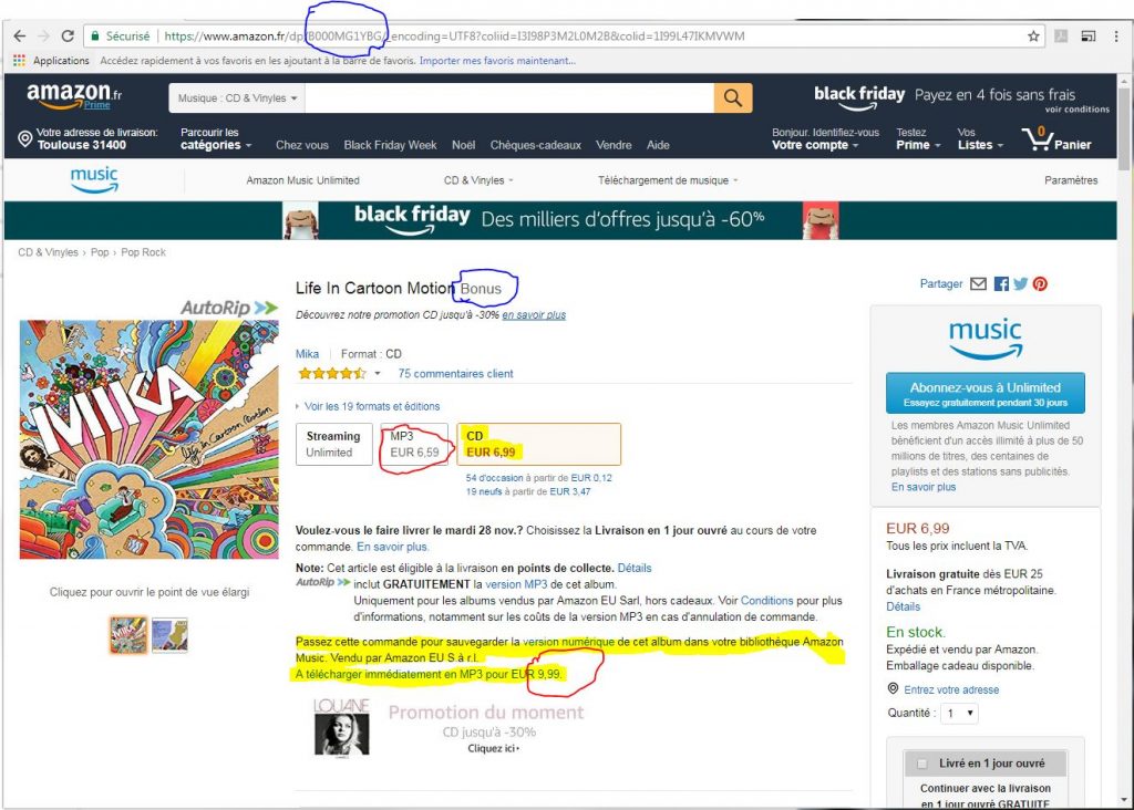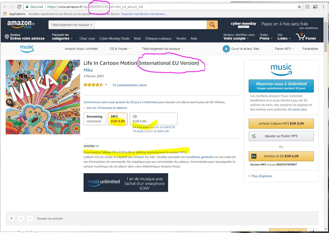 - si je veux le support CD, je n’ai qu’un choix à 6.99 => 10 chansons (au lieu de 14 précédemment) mais Amazon me les offre en mp3.