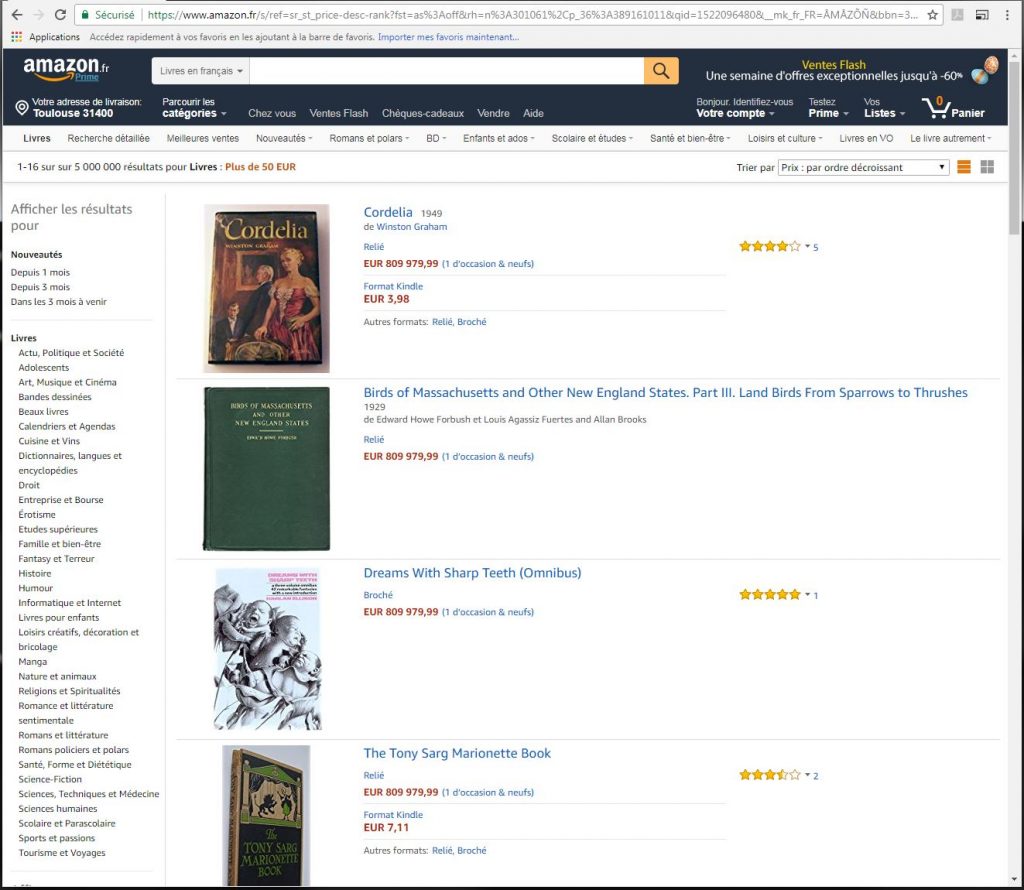 J’ai trouvé 4 livres dit “de collection” à 809.979,99 € pièce vendus par le même libraire et expédié depuis les États-Unis pour la modique somme de 2.99 €. Une affaire !