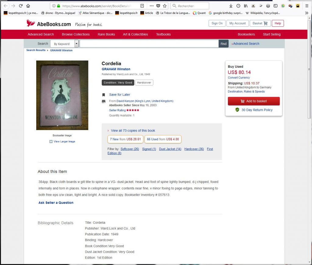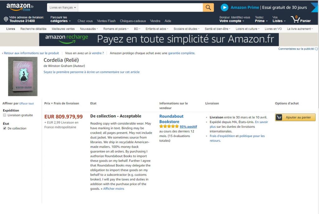 Mais a priori, il s’agit simplement d’une histoire de virgule mal placée, puis qu’après approfondissement, la même première édition de “Cordelia” sur un autre site marchand ne couterait que $80 (et $10 de frais de port)