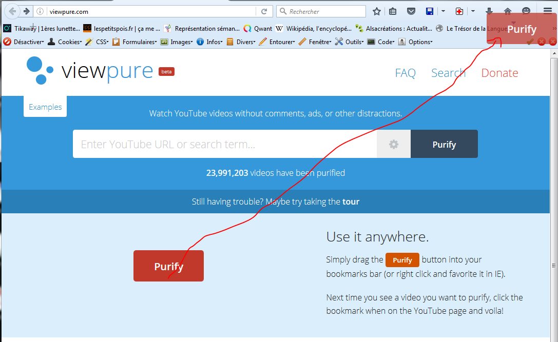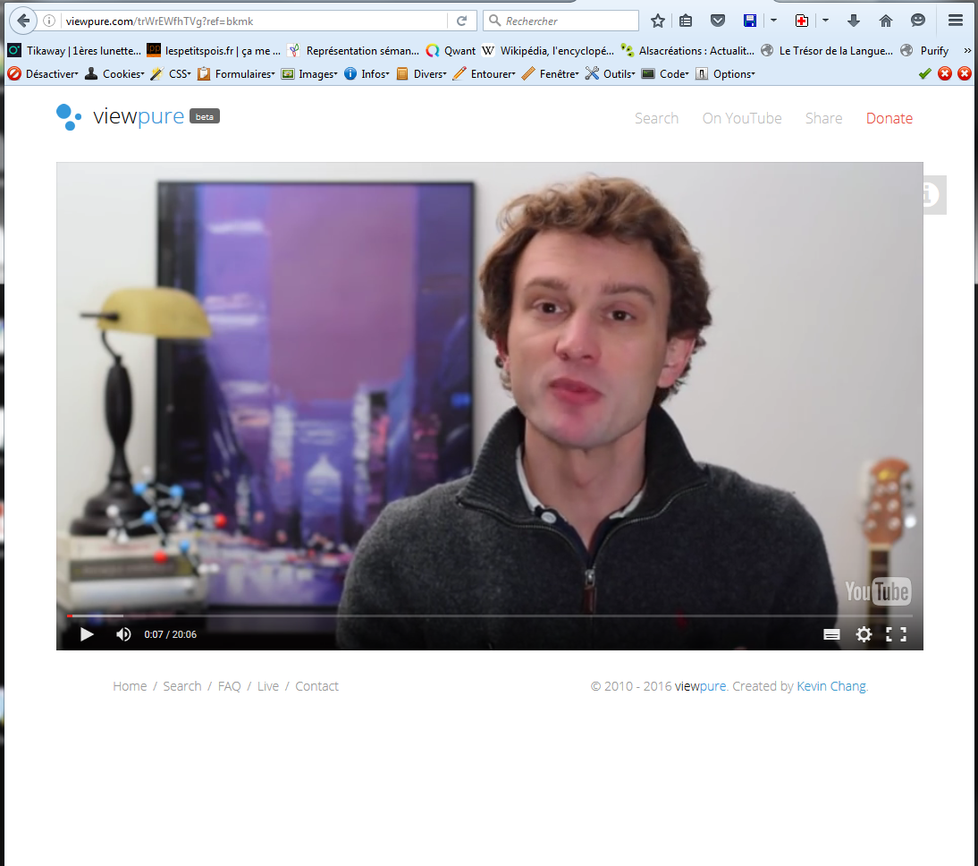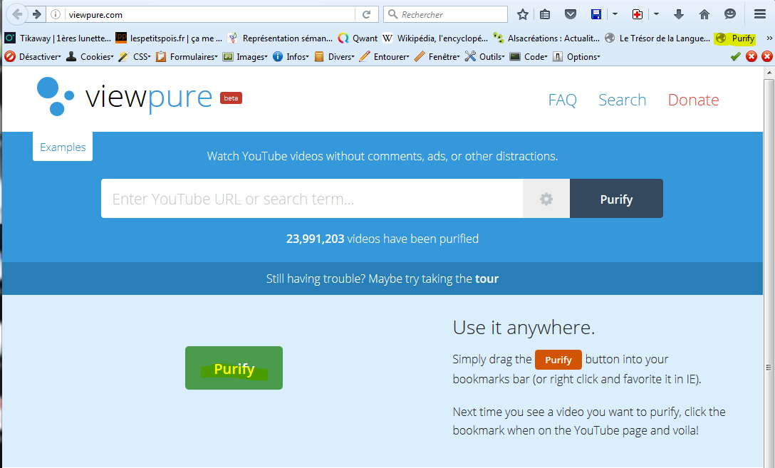 Oui, aux services au pluriel, parce que non seulement vous pouvez regarder des vidéos directement depuis le site viewpure, mais vous pouvez également ajouter un lien dans vos favoris qui va vous permettre de purifier “à la volée” la vidéo que vous vous apprêtiez à regarder sur youtube:
