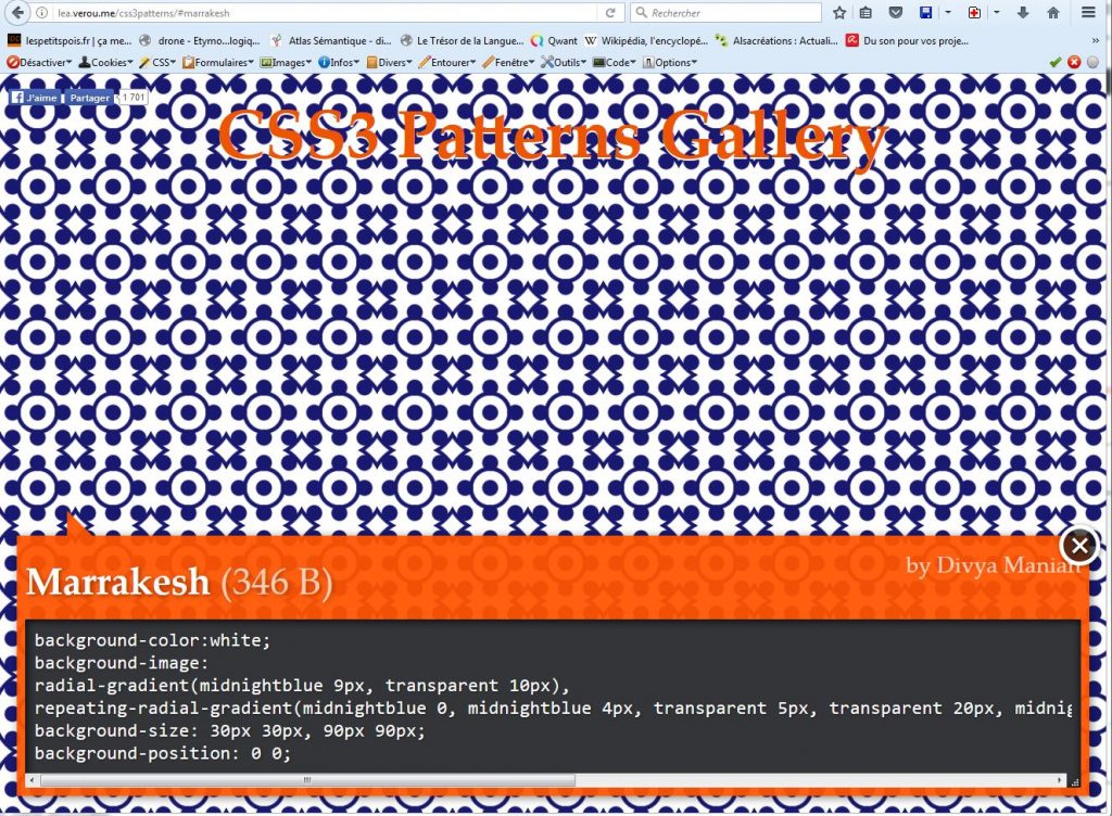 Jolie découverte aujourd’hui: les CSS3 patterns ou comment créer des fonds “imprimés”  (de div, de page etc.) à partir de motifs en CSS3.