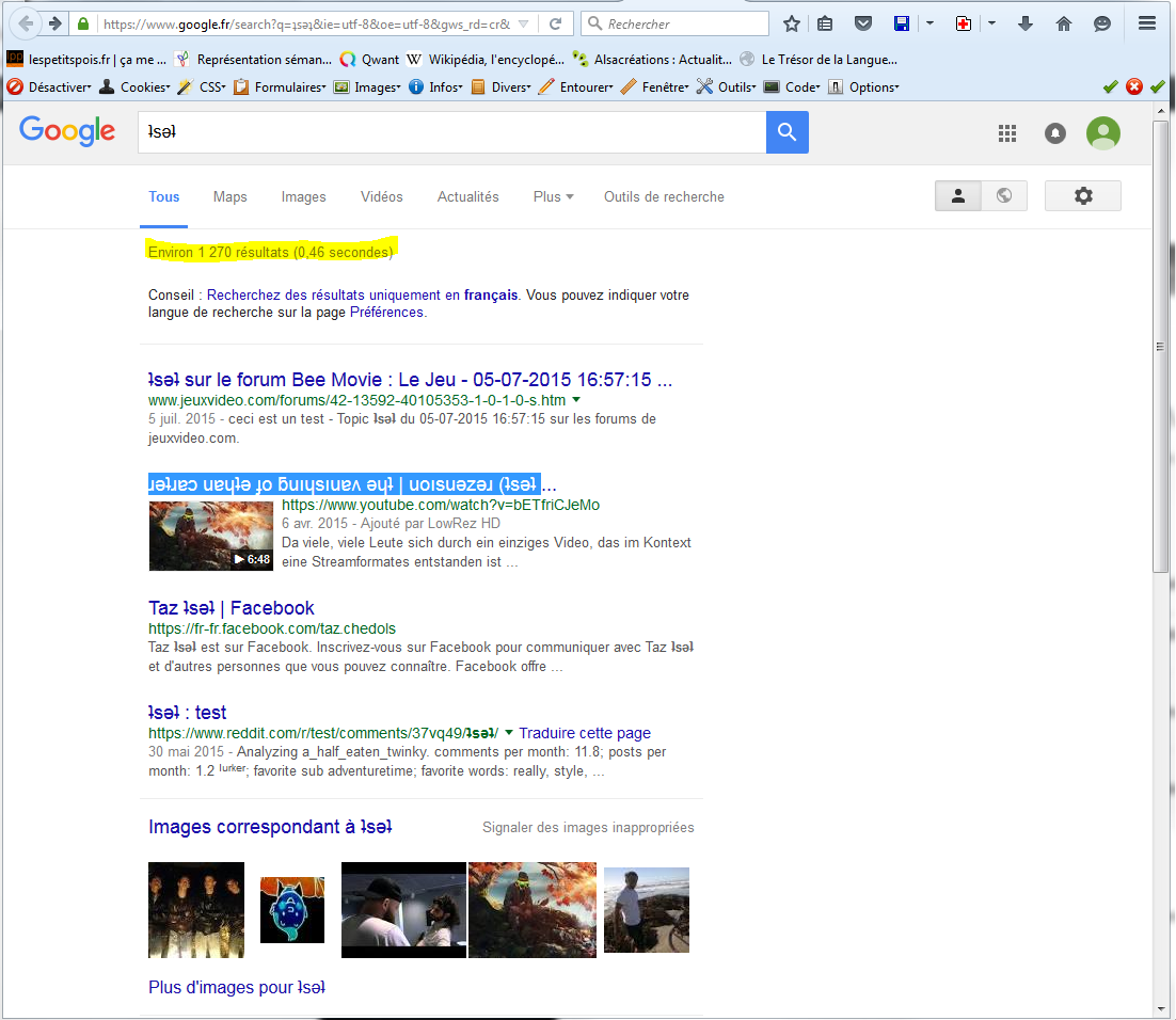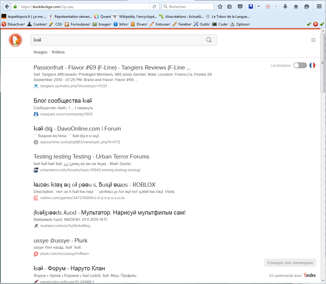 NB: Google et Duckduckgo reconnaissent et référencent les textes écrits à l’envers (Symétrie horizontale et verticale); Bing et Qwant ont plus de mal…