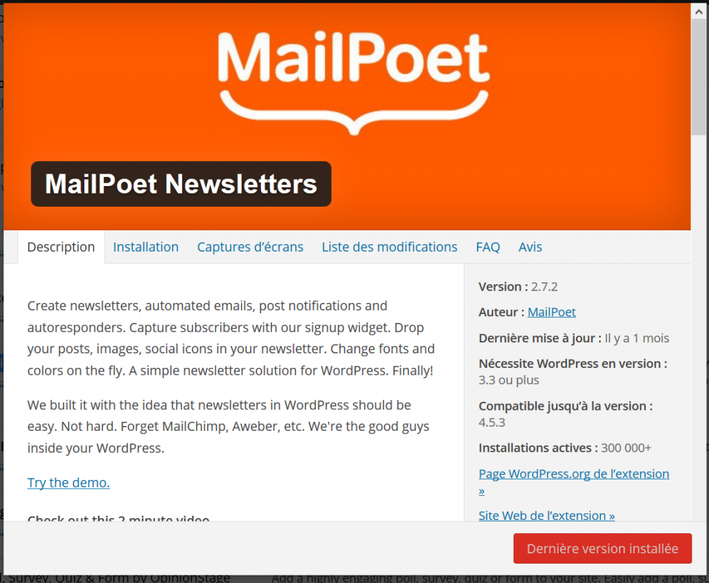 Et comme j’ai dû chercher un peu parmi les différents plugins existant, je vous offre le résultat de ma recherche: il s’agit de “MailPoet Newsletters“: