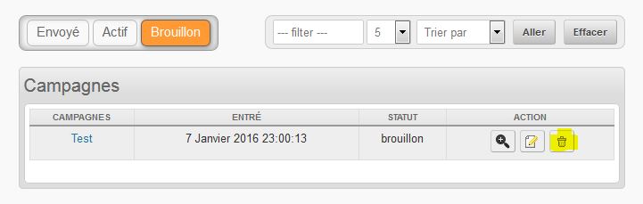 Dans les campagnes envoyées (bouton Envoyé), sélectionner la campagne à supprimer en cliquant sur l’icone loupe+; |