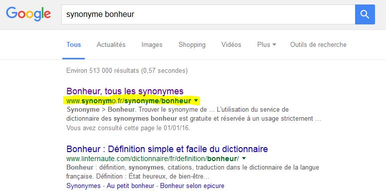 A la recherche du bonheur, je tape instinctivement “synonyme bonheur” dans Google, par flemmardise.