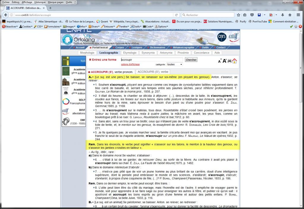 “Rem. Dans les énoncés, le verbe peut signifier « s’asseoir sur les talons, le menton à la hauteur des genoux, ou s’asseoir les jambes croisées en tailleur »”