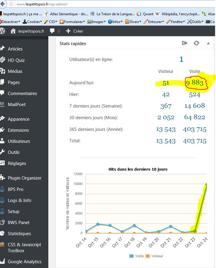 Comment je le sais ? C’est flagrant rien que sur les statistiques. Vous ne vous bousculez pas sur LPP (et pour cause, c’est mon bloc note) mais quand je constate que 51 visiteurs ont fait dans la même journée 9883 visites, c’est qu’il y a un problème…: