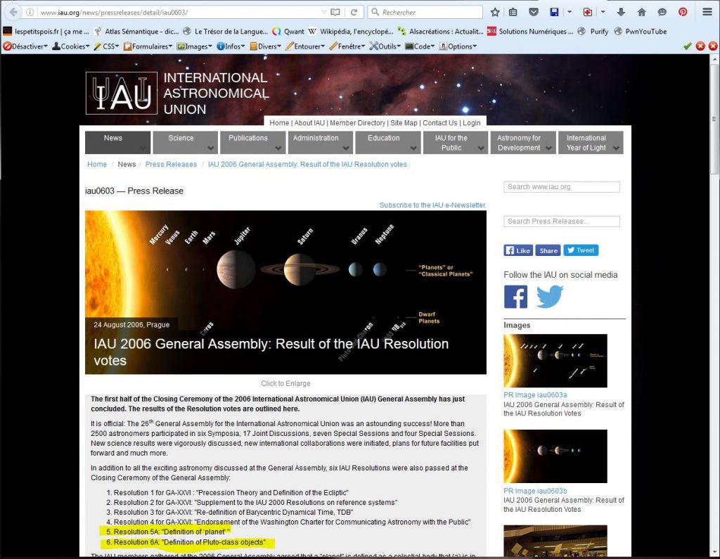 le 24 Août 2006, au cours de sa XXVIème Assemblée Générale, l’Union Internationale d’Astronomie redéfinissait le terme “planète” et créait une nouvelle catégorie de corps céleste: “les planètes naines”.