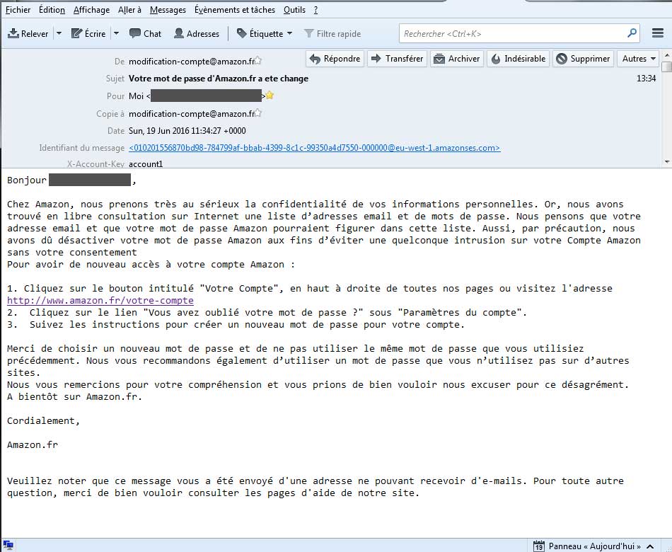 je crois comprendre que l'e-mail que j'ai reçu aujourd'hui intitulé "Votre mot de passe d'Amazon.fr a ete change" est un vrai e-mail de vos services.