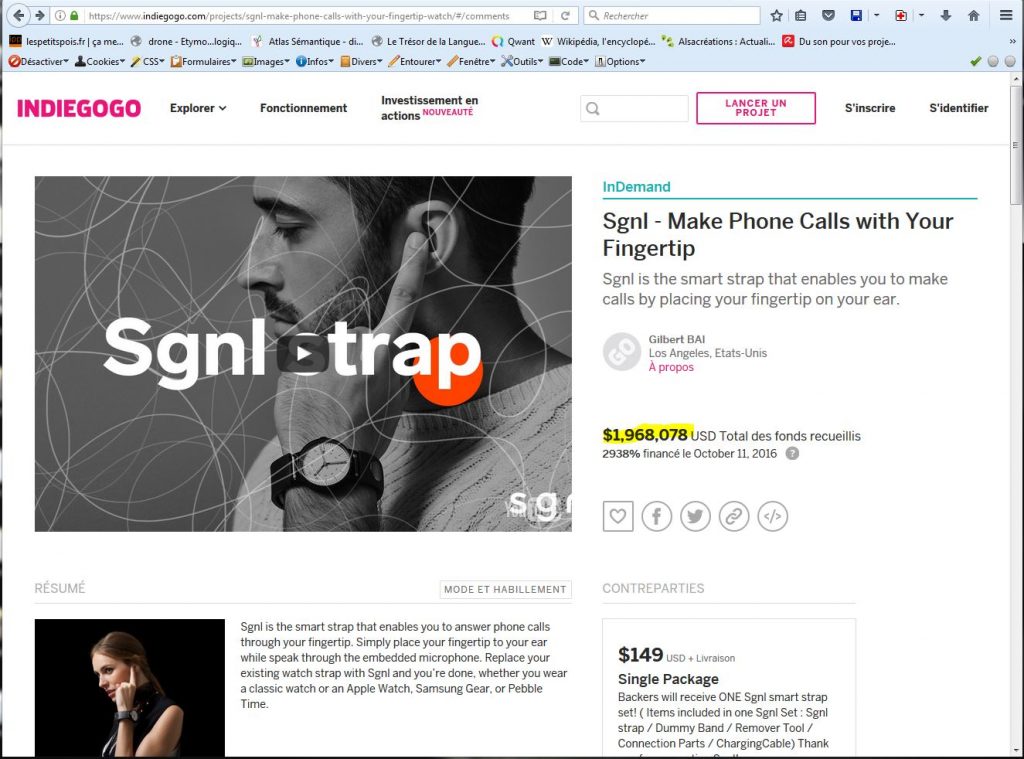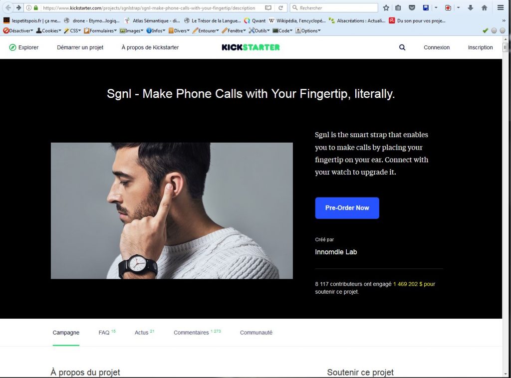 1ère levée avec Kickstarter: https://www.kickstarter.com/projects/sgnlstrap/sgnl-make-phone-calls-with-your-fingertip