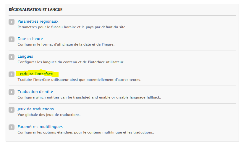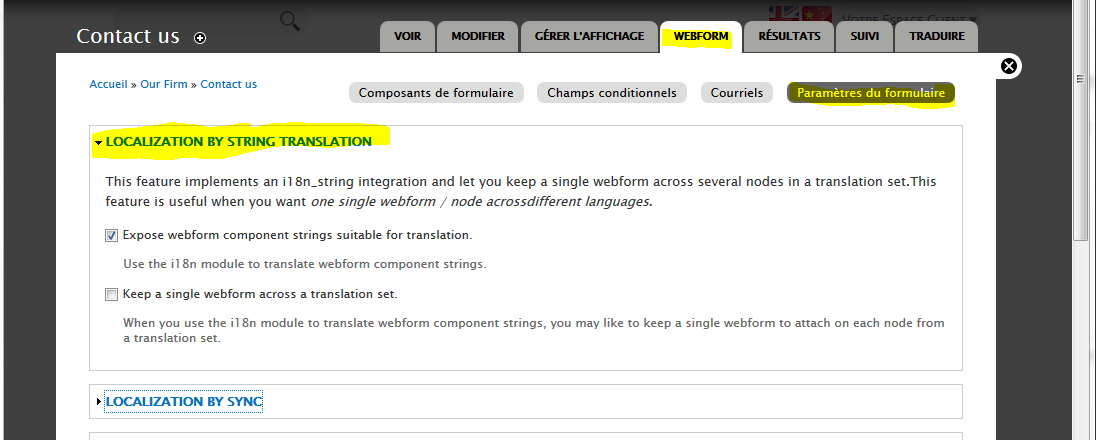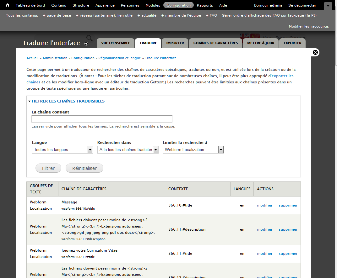 Si on a coché “Expose webform component strings suitable for translation”, on retrouve tous les champs à traduire dans admin/config/regional/translate: