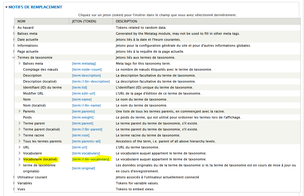 Pour info, tous les motifs de remplacement (ou token) utilisables sont listés dans la même section juste en dessous: