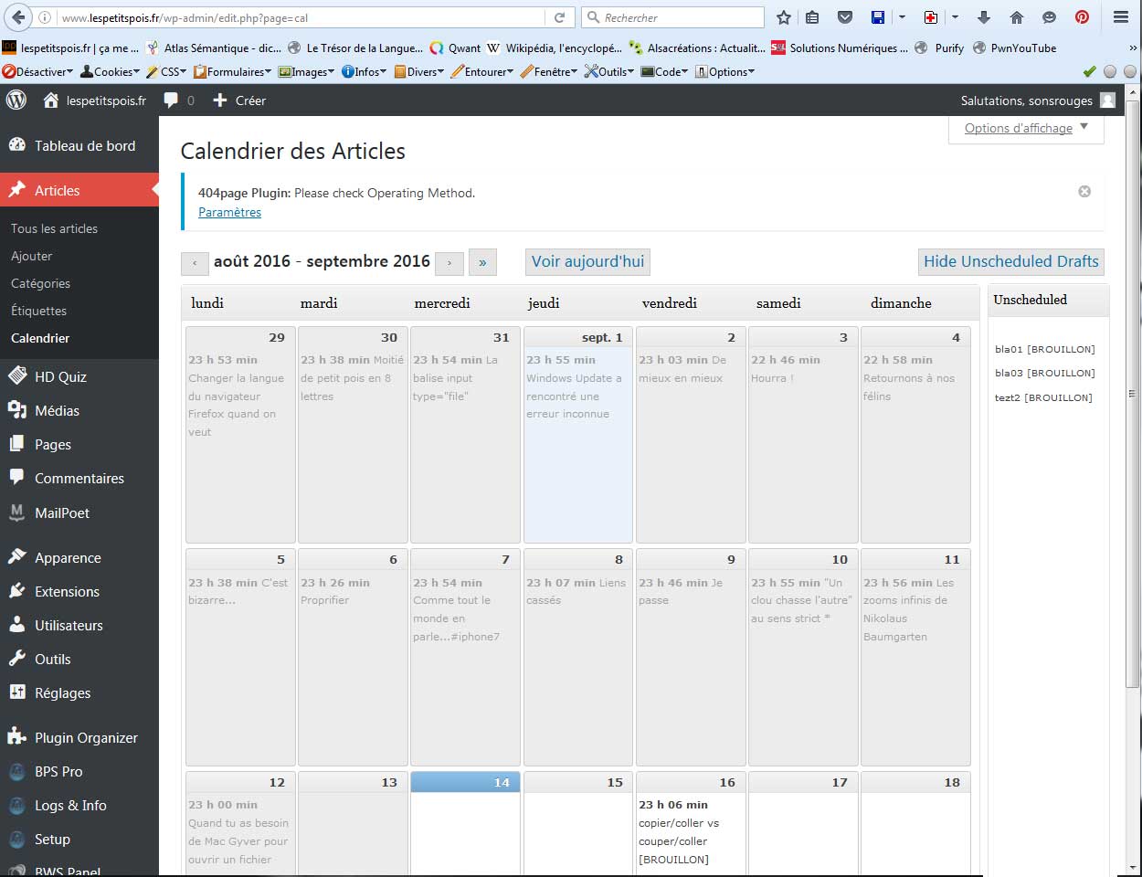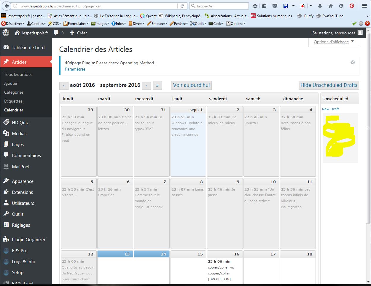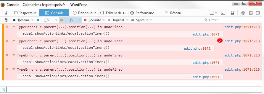 C’est ma console javascript qui m’en a fait part après l’installation du plugin WordPress Editorial Calendar , un logiciel permettant de programmer plus facilement la mise en ligne des articles en les faisant apparaître dans un calendrier: les brouillons d’un côté, les articles publiés dans le calendrier.
