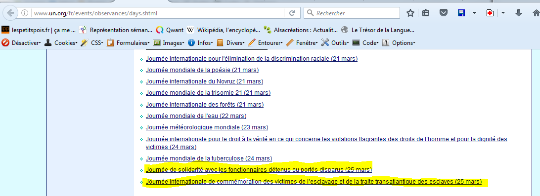 C’était aussi le Journée de solidarité avec les fonctionnaires détenus ou portés disparus, et la Journée internationale de commémoration des victimes de l’esclavage et de la traite transatlantique des esclaves .