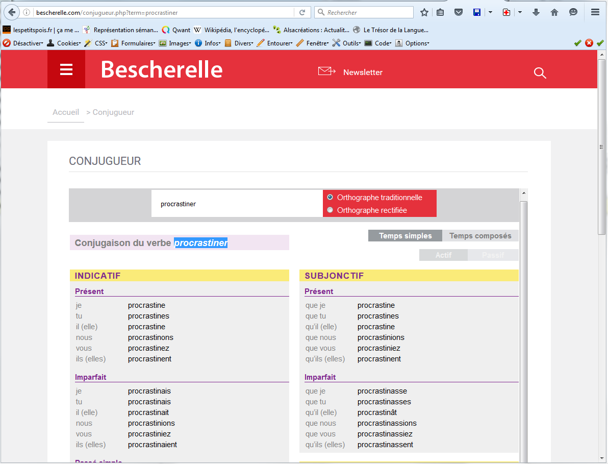Mais pas sans un petit cadeau tout de même: la conjugaison de ce magnifique verbe “procrastiner”; à lire à voix haute, évidemment: http://bescherelle.com/conjugueur.php?term=procrastiner