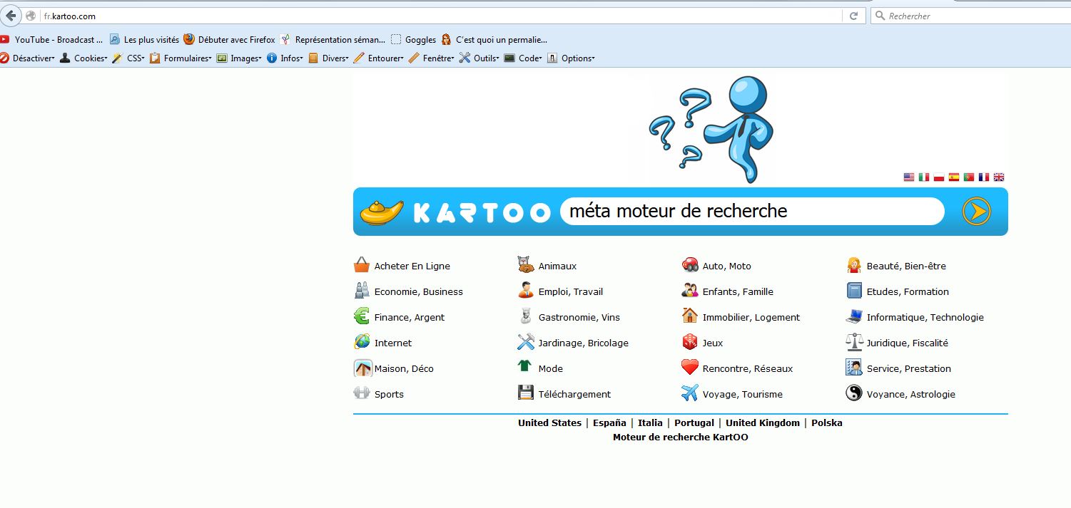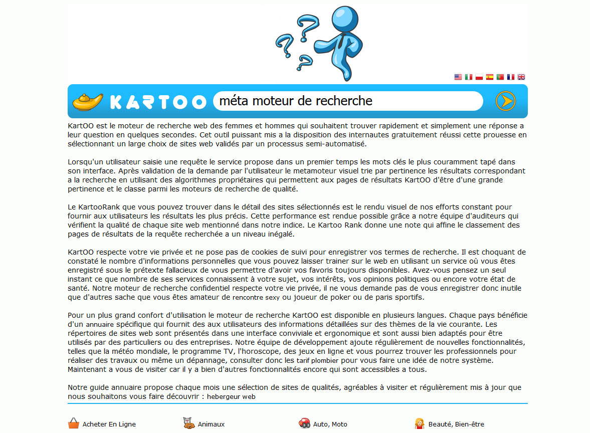 KartOO est le moteur de recherche web des femmes et hommes qui souhaitent trouver rapidement et simplement une réponse a leur question en quelques secondes. Cet outil puissant mis a la disposition des internautes gratuitement réussi cette prouesse en sélectionnant un large choix de sites web validés par un processus semi-automatisé.