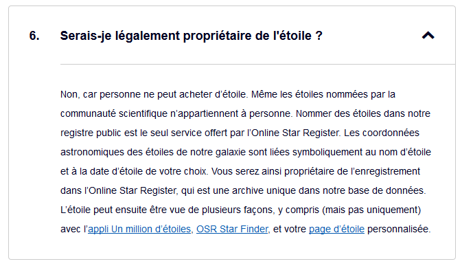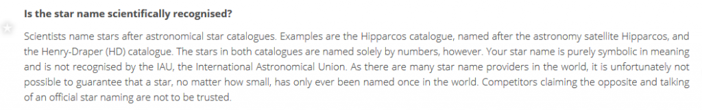 Et pour info , il y a beaucoup de “registres” actifs dans ce domaine. Plus pertinent, j’ai trouvé sur http://www.starling.global/faq la réponse à la question “Est-ce que les noms des étoiles sont scientifiquements reconnus”. La réponse est également non.