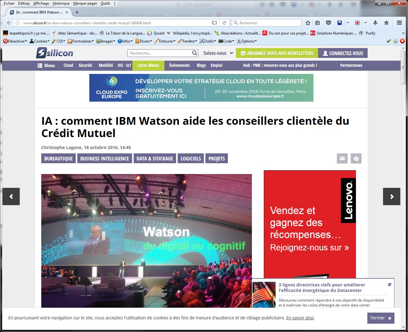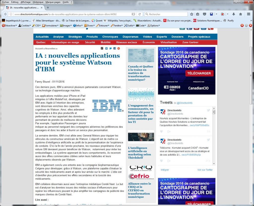 Et en ce mois de Novembre, c’est festival. On parle de compagnies aériennes, d’automobile, de pharmacie, de campagnes de pub… http://www.directioninformatique.com/ia-de-nouvelles-applications-pour-le-systeme-watson-dibm/44592