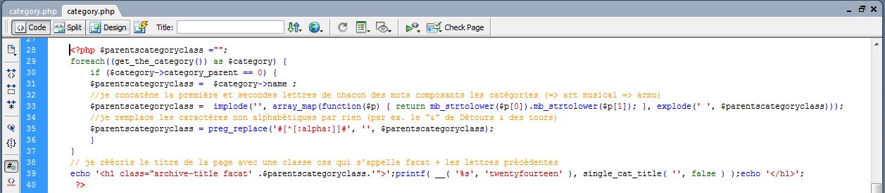Pour cela, on va remplacer le code qui fabrique le titre par un code qui, en plus de fabriquer le titre, fabrique une class css particulière (unique serait mieux évidemment) en fonction de chaque catégorie.