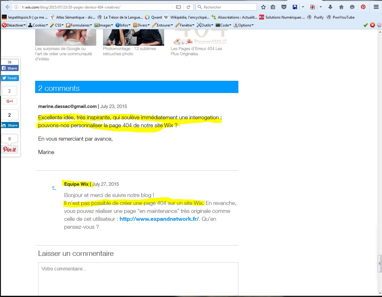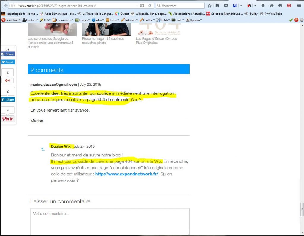 Où une lectrice du blog et semble-t-il utilisatrice du service Wix de création de site demande si c’est possible de personnaliser sa page d’erreur 404 sur Wix… et où l’équipe de Wik lui répond qu’il n’est pas possible de créer une page 404 sur un site Wix…