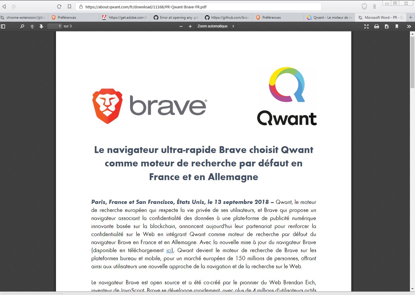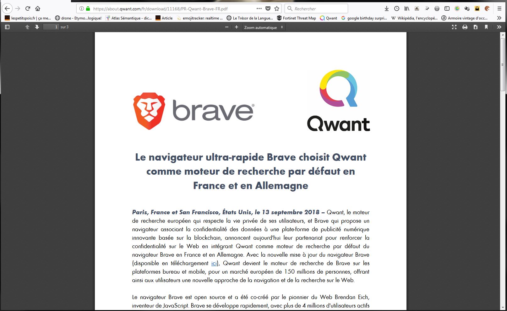 2/ Ça c’est la page du communiqué de presse de Qwant à propos de son rapprochement avec Brave, vue avec le navigateur Brave: